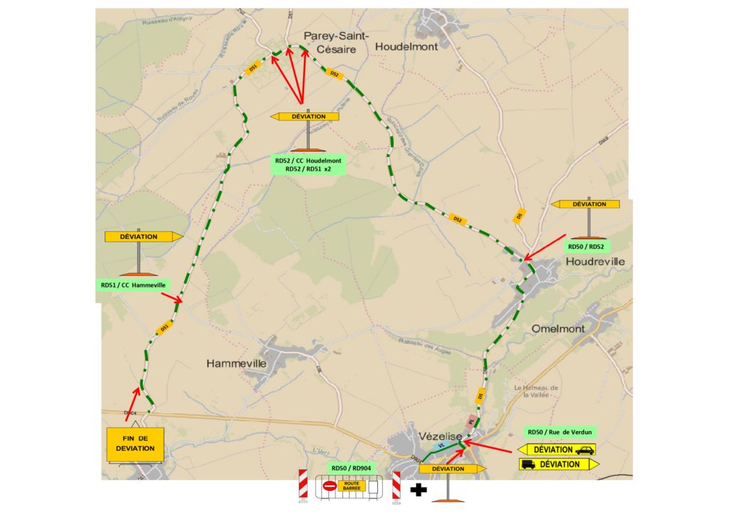 • Une déviation sera mise en place via Houdreville et Parey-Saint-Césaire.