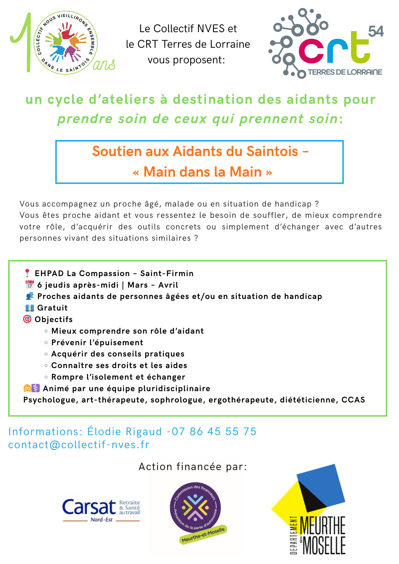 Le Collectif Nous Vieillirons Ensemble dans le Saintois (NVES), en partenariat avec le CRT Terres de Lorraine, propose un cycle gratuit d’ateliers à destination des aidants, au cours du 1er trimestre 2026.