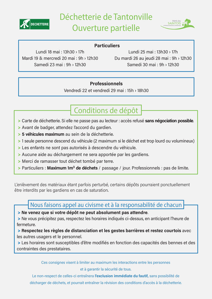 Depuis le lundi 4 mai, la déchetterie du Saintois, sise à Tantonville, est de nouveau ouverte pour la plupart des déchets. Avec des conditions particulières en raison de la crise sanitaire Covid-19. Voici une fiche récapitulative