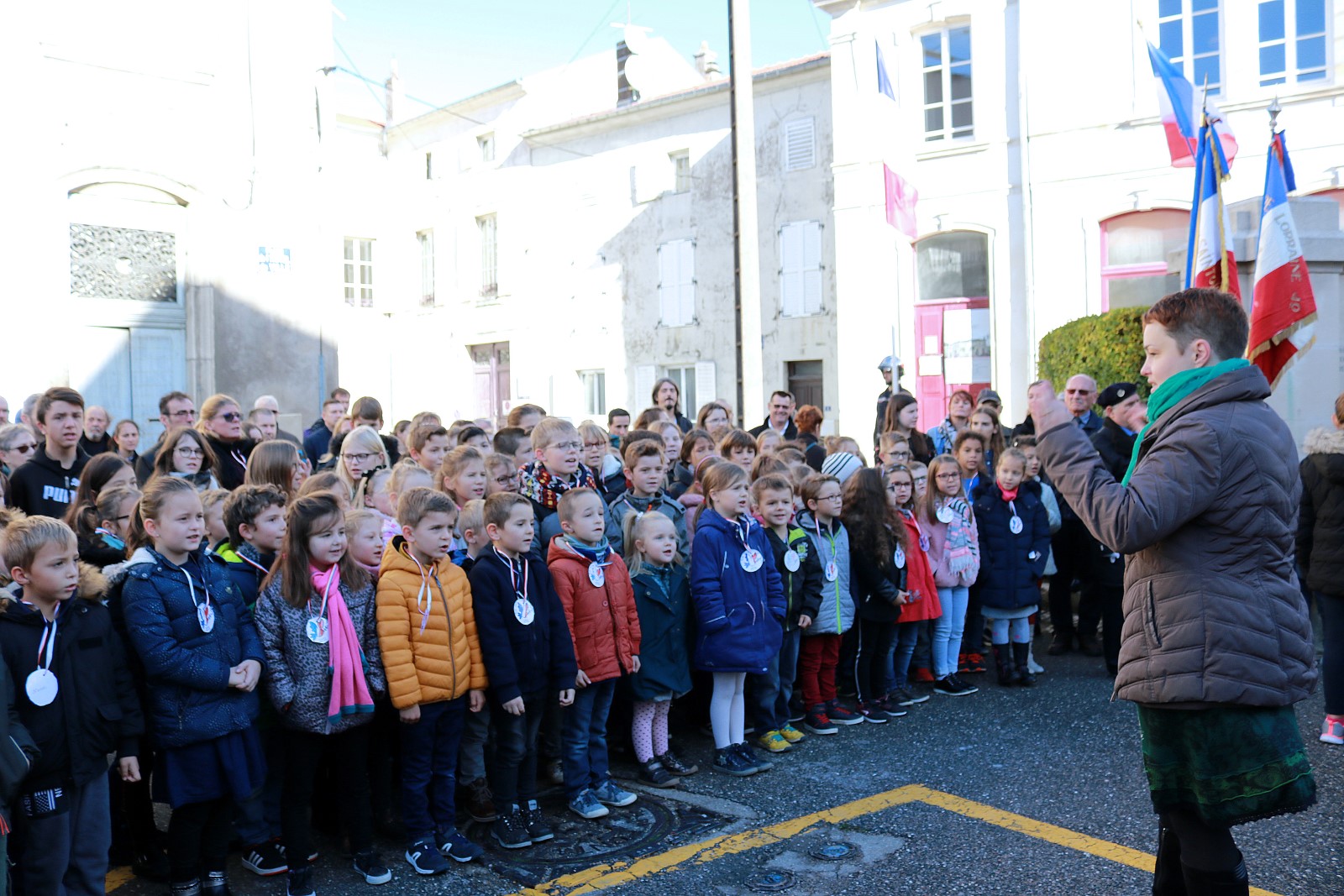 Comme dans toutes les communes de France, la commune de Vézelise a célébré le centième anniversaire de l’Armistice du 11 Novembre 1918 avec une ferveur et un éclat particuliers. Pour la circonstance, les établissements scolaires se sont joints à cette journée de mémoire. Les collégiens de Robert Géant ont lu la composition française sur le thème du 11 novembre 1918, écrite certainement en 1920 par Raymonde Furgaux jeune fille de Vézelise alors qu’elle était normalienne à l’ENI de Nancy et qui deviendra par la suite l’épouse du maire de Vézelise. Quant aux enfants de l’école élémentaire, ils avaient confectionné des médaillons aux couleurs de la France rappelant l’événement. Ils devaient aussi faire lecture de poèmes écrits en classe. Et surprise pour tous : lors de l’interprétation de la Marseillaise, sous la conduite d’Anne-Catherine Peroche, directrice de l’école élémentaire Marie Marvingt, ils ont entonné le 6ème couplet dit couplet des enfants. Les élèves étaient soutenus par le trompettiste François Savary qui joua toutes les sonneries réglementaires. L’appel des morts fut lu par Camille, Manon et Nathan.